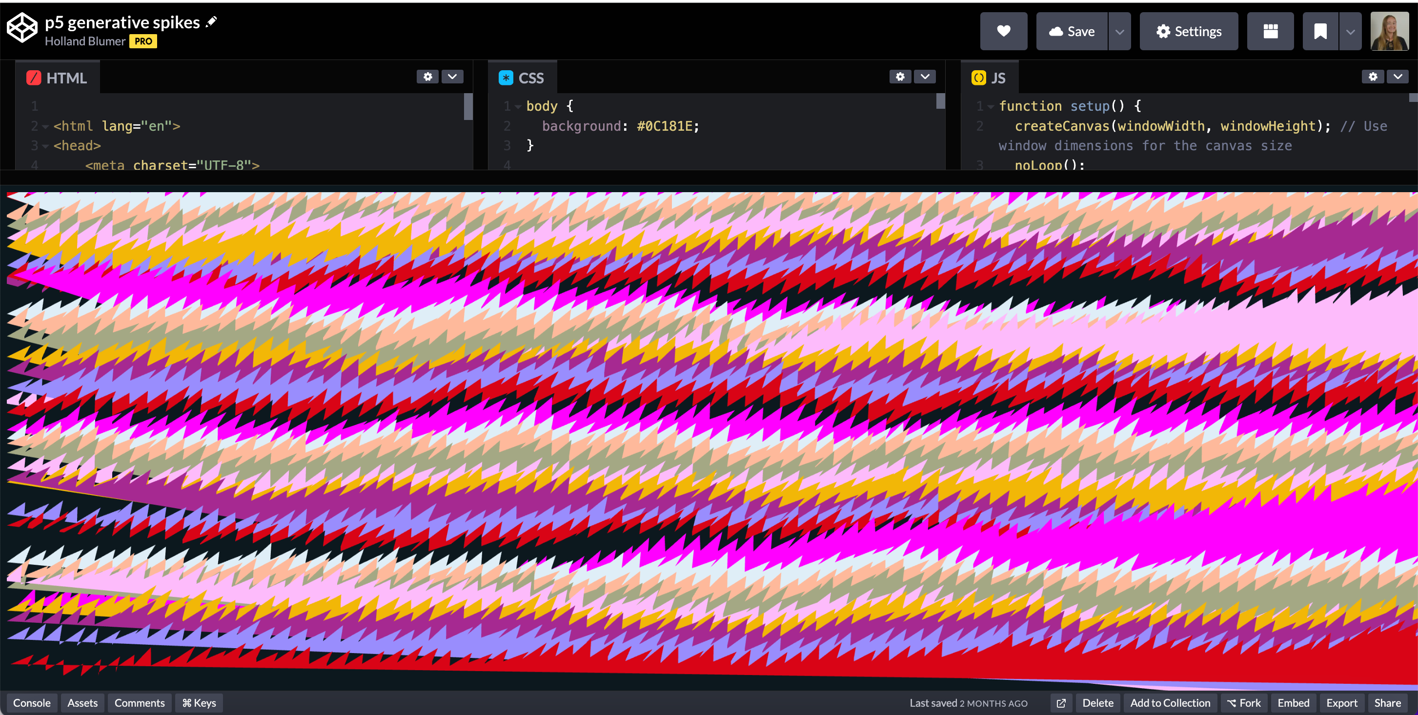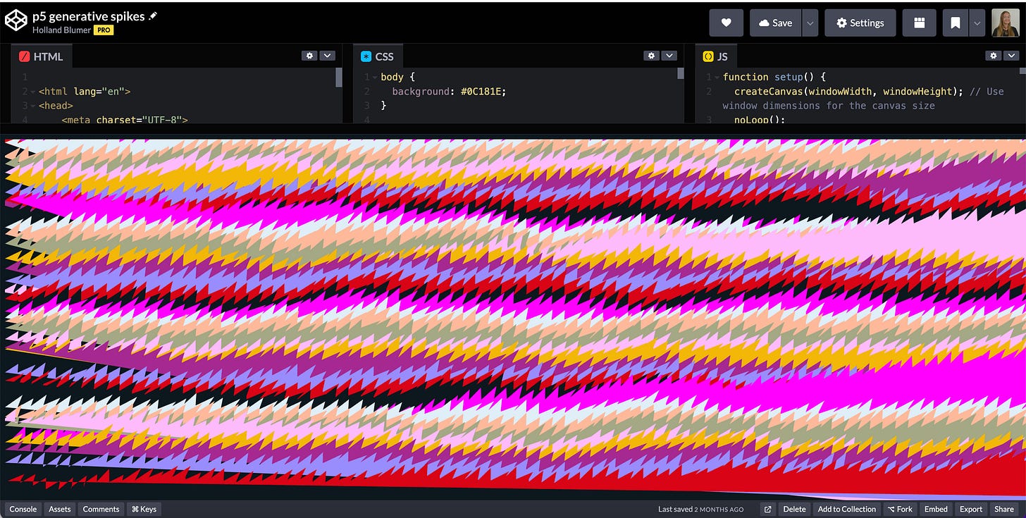 This generative artwork is built using p5.js, layering 50 jagged waves with randomized distortions to create an abstract, glitchy terrain. Each layer is drawn using Perlin noise and a key part of this effect comes from the function drawLayer(), where each wave’s peaks and valleys are mapped with noise(xOff, noiseOffset), producing natural variations. The layers are drawn from back to front, with slight rotations applied every few layers that I got from here, introducing subtle imperfections for a more organic look.